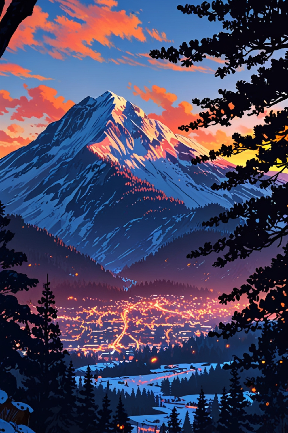 A glowing mountain stands tall under a vibrant sunset, overlooking a cozy, illuminated town nestled in the valley below—pure magic and warmth in nature's embrace.